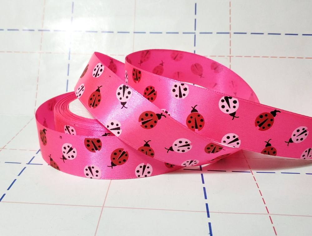 Назад 001 Лента атласная 25мм с рисунком 23м/боб (+-1м) Божья коровка ярко-розовый
