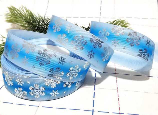 - 018 25мм Репсовая лента с рисунком 23м/боб (+-1м) Серебряные снежинки Градиент