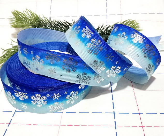 - 019 25мм Репсовая лента с рисунком 23м/боб (+-1м) Серебряные снежинки Градиент