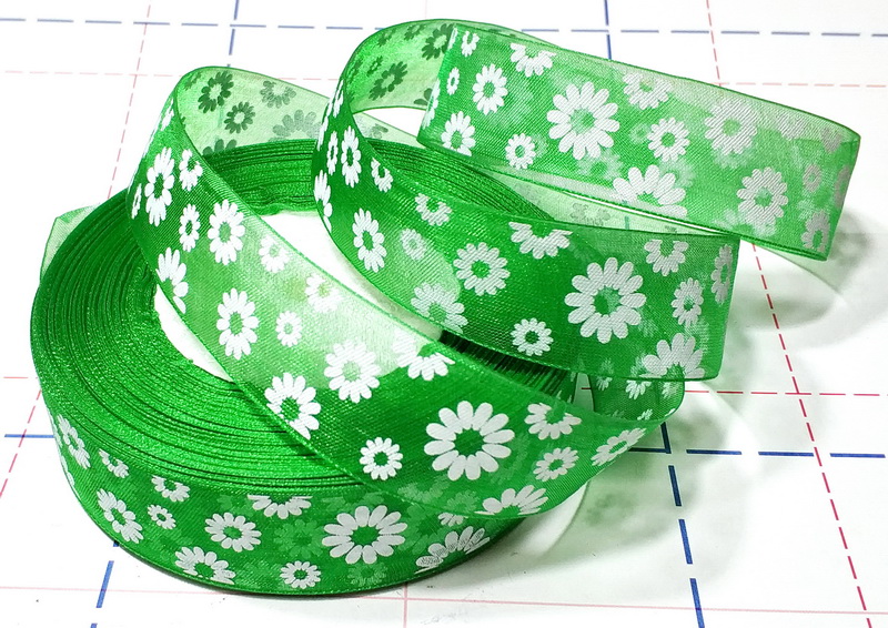 - 05 Лента Органза Ромашка 25мм 45,72 м/боб (+-1м) Зеленый/белый