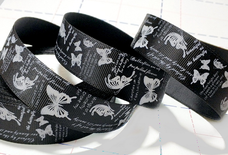 - 079 25мм Репсовая лента с рисунком 23м (+-1м) Бабочки-надписи Черный/белый