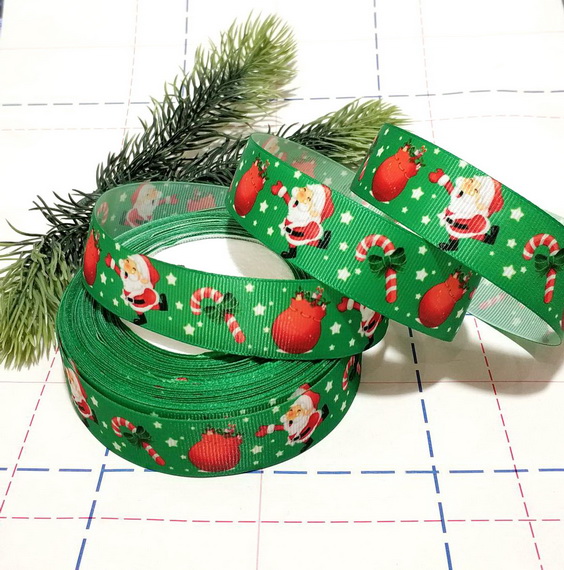 - 110 25мм Репсовая лента с рисунком 23м/боб (+-1м) Санта с подарками Зеленый