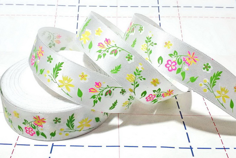 - 121 Лента атласная 25мм с рисунком 23м/боб (+-1м) Цветы белый