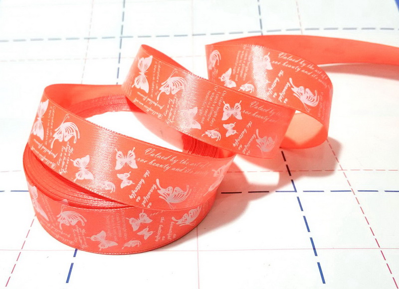 Назад 137 Лента атласная 25мм с рисунком 23м/боб (+-1м) Бабочки-надписи ярко-оранжевый/белый