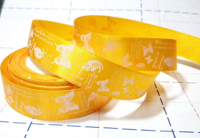 Назад 157 Лента атласная 25мм с рисунком 23м/боб (+-1м) Бабочки-надписи темно-желтый/белый
