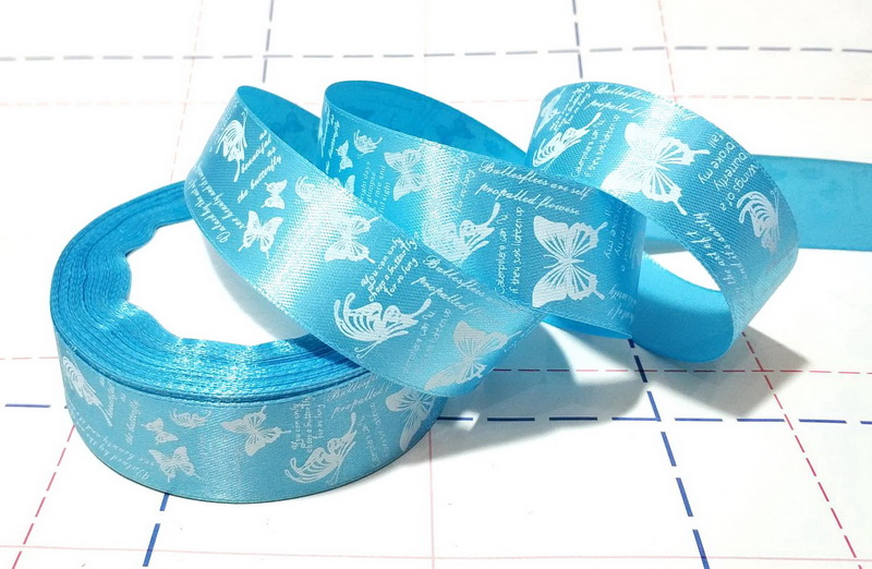 Назад 158 Лента атласная 25мм с рисунком 23м/боб (+-1м) Бабочки-надписи голубой/белый
