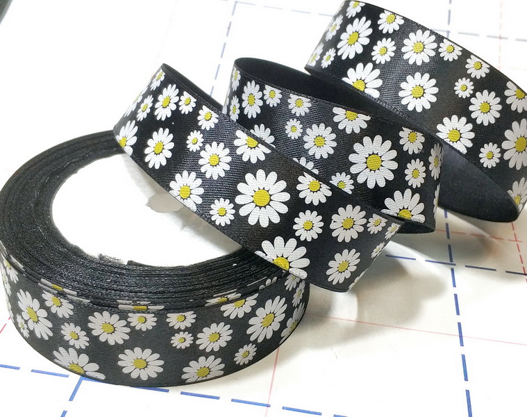 Назад 165 Лента атласная 25мм с рисунком 23м/боб (+-1м) Ромашки черный