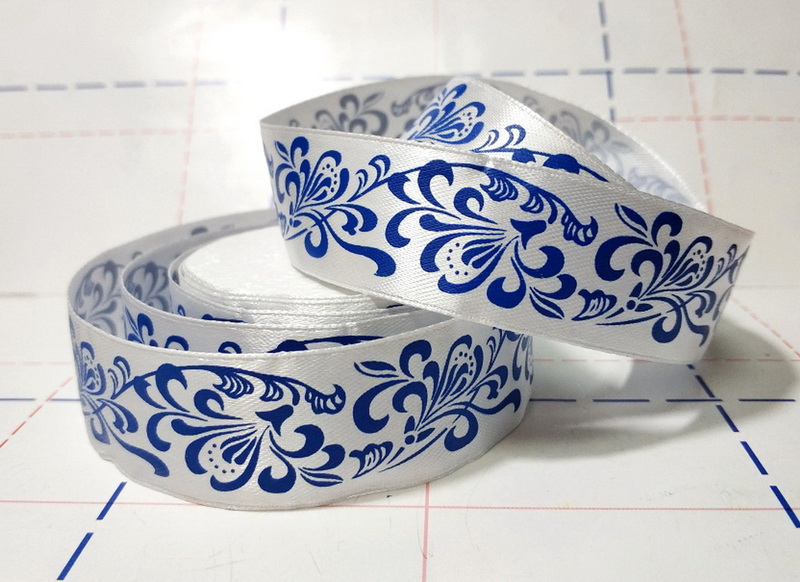- 172 Лента атласная 25мм с рисунком 23м/боб (+-1м) Гжель белый/синий