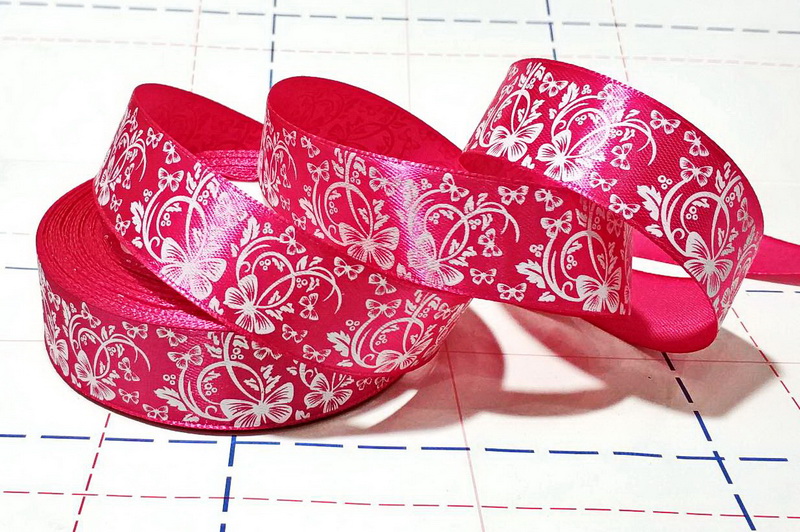 Назад 274 Лента атласная 25мм с рисунком 23м/боб (+-1м) Бабочки-цветы малиновый/белый
