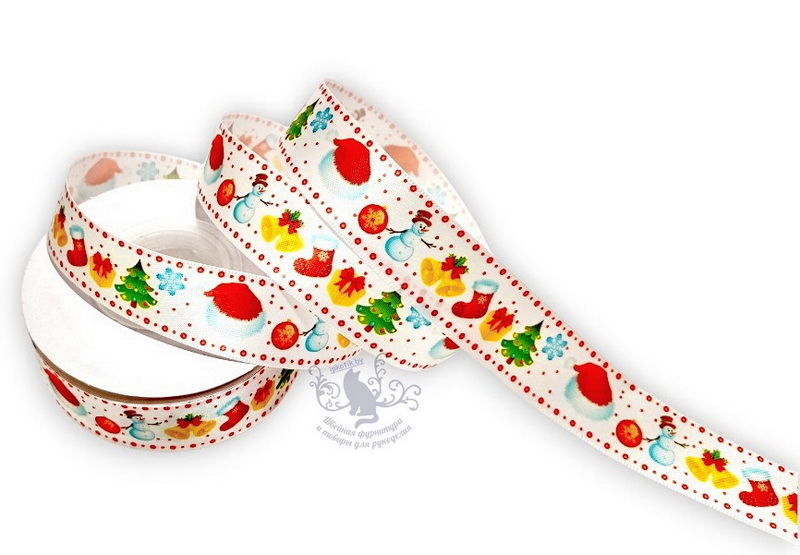 - 307 Лента атласная 25мм с рисунком 23м/боб (+-1м) Елка подарок носок
