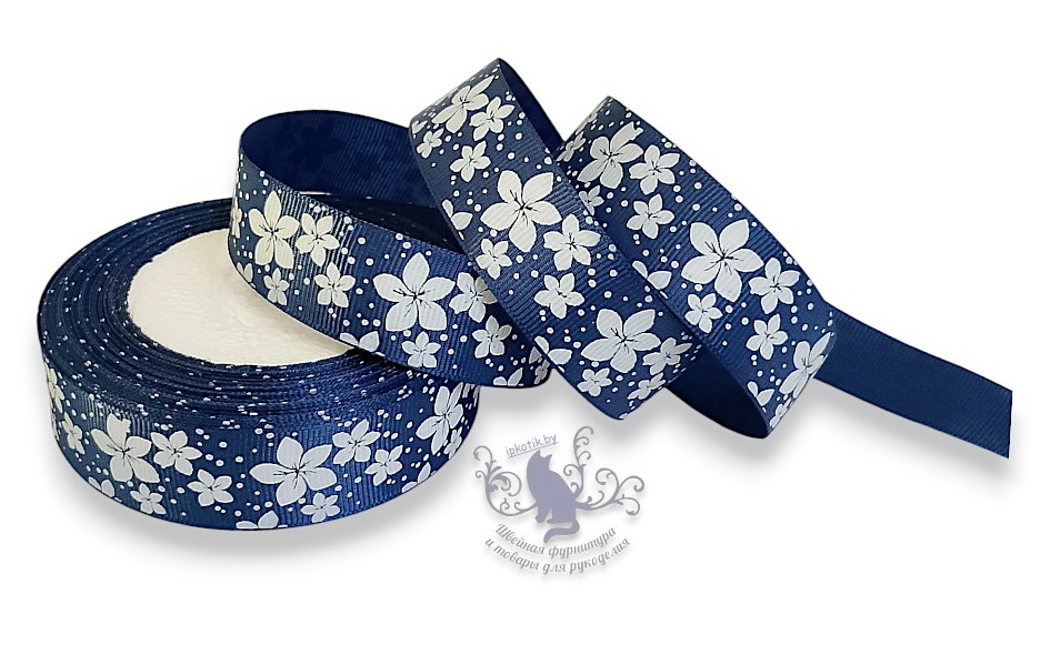 - 336 25мм Репсовая лента с рисунком 23м/боб (+-1м) Цветы Темно-синий/белый