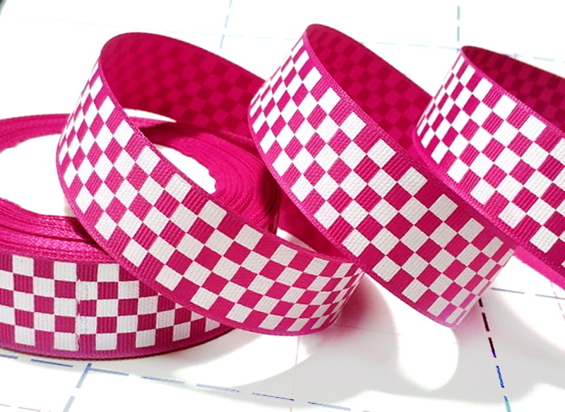 - 388 25мм Репсовая лента с рисунком 23м (+-1м) Шашечки Ярко-розовый/белый