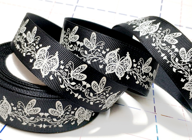 - 417 25мм Репсовая лента с рисунком 23м (+-1м) Бабочки Черный/белый