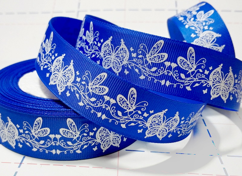 - 418 25мм Репсовая лента с рисунком 23м (+-1м) Бабочки Синий/белый