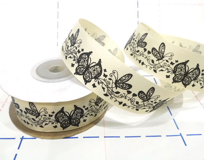 - 519 25мм Репсовая лента с рисунком 9,1м/боб (+-0,3м) Бабочки Айвори/черный