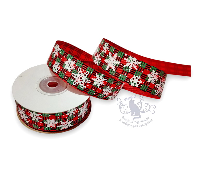 - 598 25мм Репсовая лента с рисунком 18,3м/боб (+-1м) Снежинки Красно-зеленый/белый