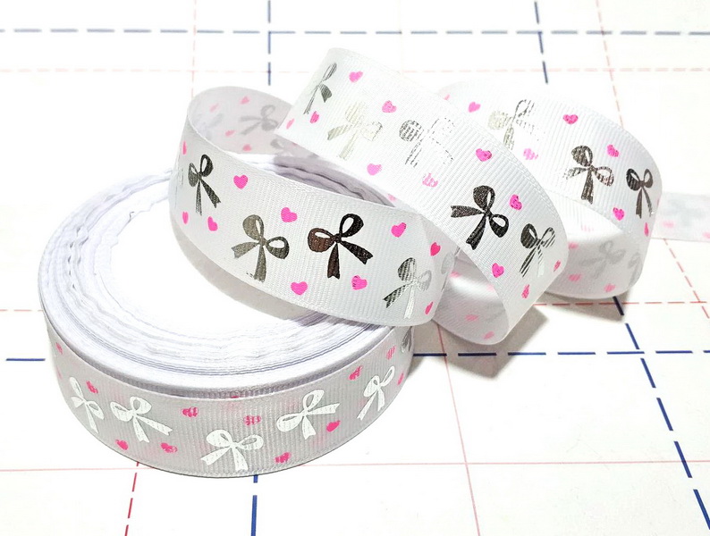 - 703 25мм Репсовая лента с рисунком 23м (+-1м) Серебряный бант и сердечки