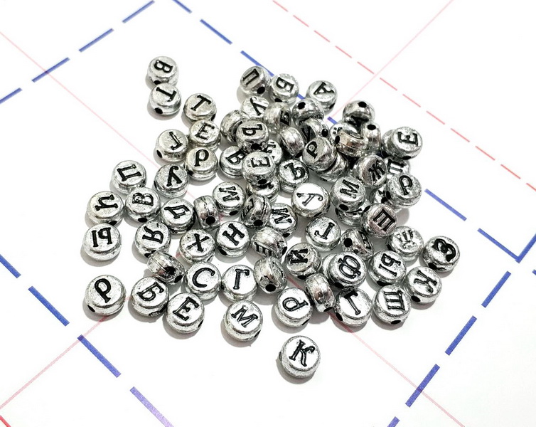 - Бусины круглые 7мм Буквы русские 10гр/уп Серебро