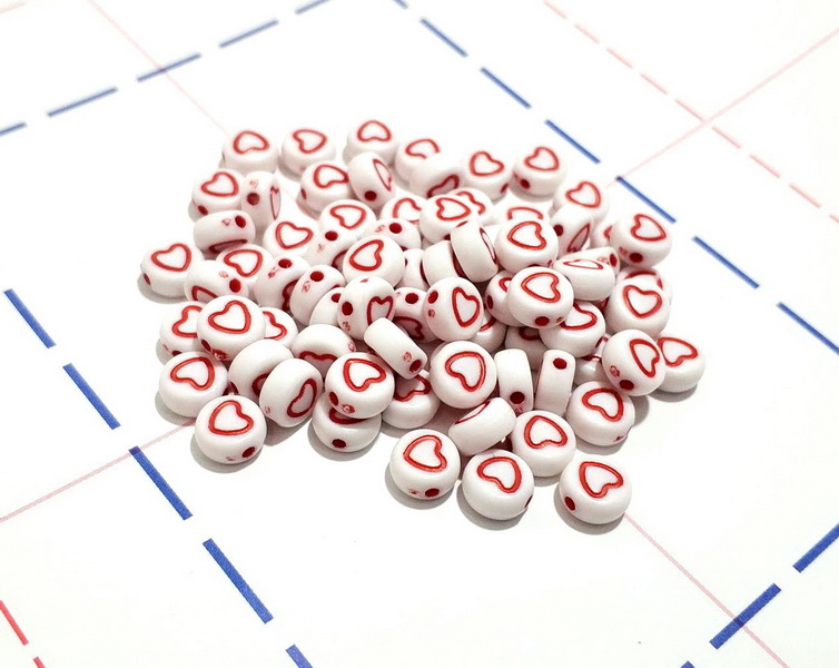 - Бусины круглые 7мм Сердечко 10гр/уп Белый/красный